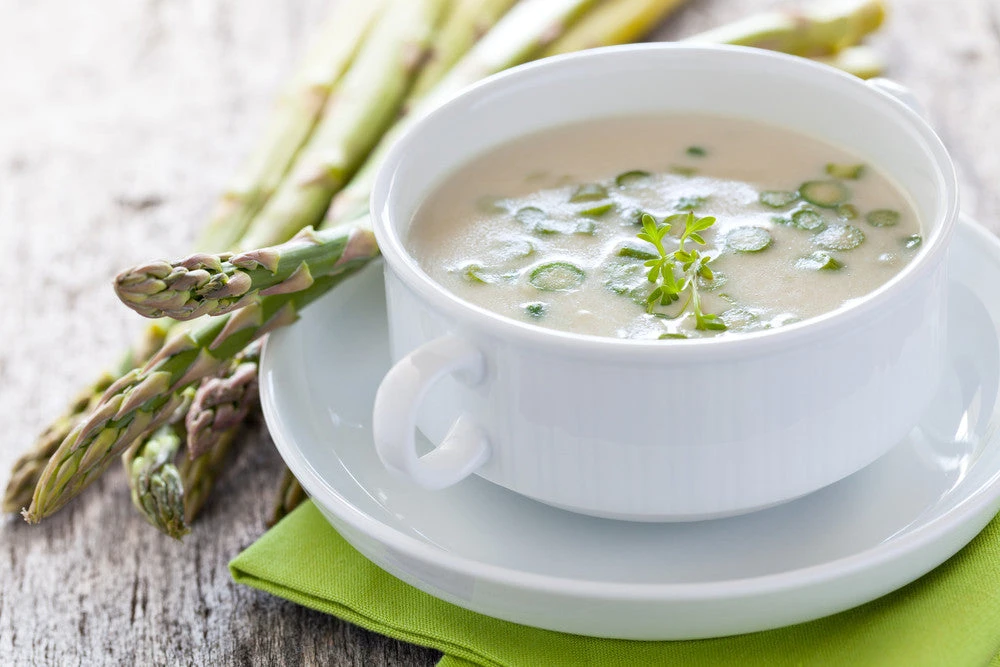 Asparagus can be considered a power food among veggies. It is packed with vitamins and minerals, delivering a more complete balance than any other. Asparagus is a good source of vitamin A, B6 and C, as well as iron, potassium, riboflavin, niacin, and thiamine. It is high in fiber and low in carbohydrates, contains no fat, no cholesterol and has only 20 calories per 1/2 cup serving.